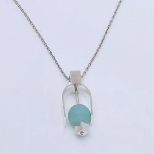 A soft matte amazonite stone rests within an open sterling silver structure, suspended along a horizontal line and balanced by a small square silver accent at the base. The composition feels both minimal and deliberate, with each element held in quiet relationship to the next.