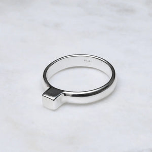 A polished sterling silver band finished with a sculpted silver cube. Clean lines, intentional form, and a quiet sense of strength.