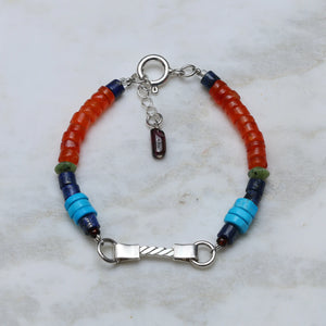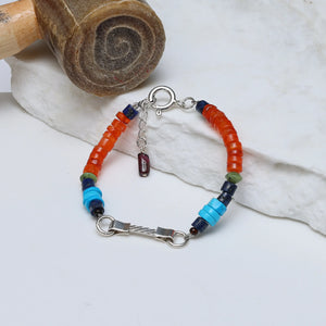 This bracelet moves with a steady, considered rhythm, where warm earth tones and cool blues meet in calm balance. Smooth heishi beads and sculptural accents create a natural flow that feels composed and effortless, each element chosen for how it contributes to the whole rather than standing alone.