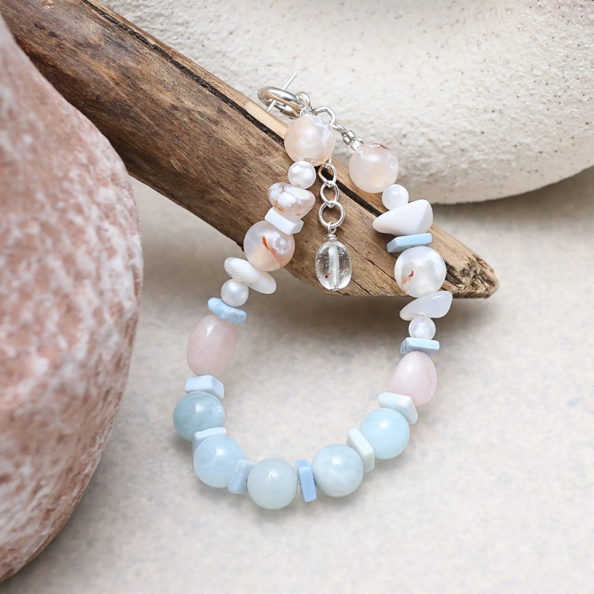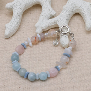 A handcrafted gemstone bracelet centered around Aquamarine as the power stone, paired with Aqua Beryl, Morganite, and Denim Opal. Subtle variations in tone and translucency create a calm, balanced composition designed to support clarity, ease, and quiet joy in daily wear.
